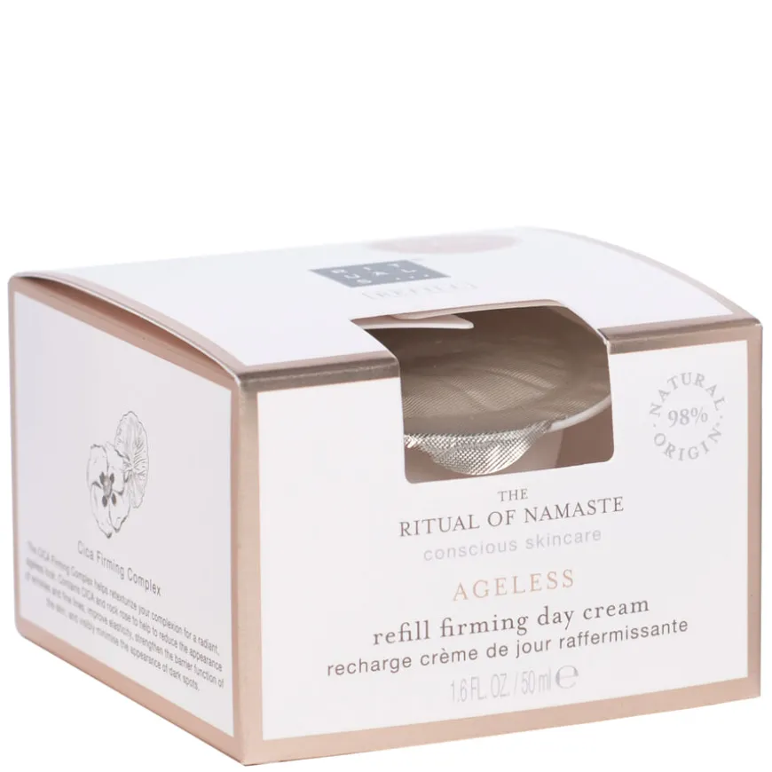 The Ritual Of Namaste Ageless Firming Day Cream Refill er en rik og luksuriøs dagkrem i refillformat som reduserer rynker og uttrykkslinjer, samtidig som den styrker og strammer opp huden. Formulert med CICA Firming Complex, en kraftfull kombinasjon av gotu kola og solrose, bidrar den til å forbedre elastisiteten og gi dyp næring uten å føles fet på huden.