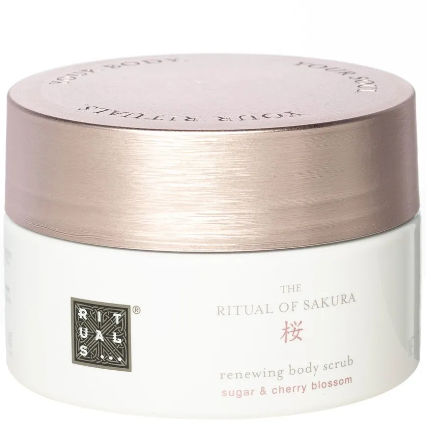 The Ritual Of Sakura Renewing Body Scrub er en nydelig og eksfolierende sukkerskrubb med en base av japanske oljer og kirsebær. Skrubben vekker huden til live igjen, og fjerner livløs, tørr hud. Innholder riskli, tsubaki og jojobaolje som søger for å etterlate huden sunn og frisk. Med en elegant duft av kirsebærblomst.