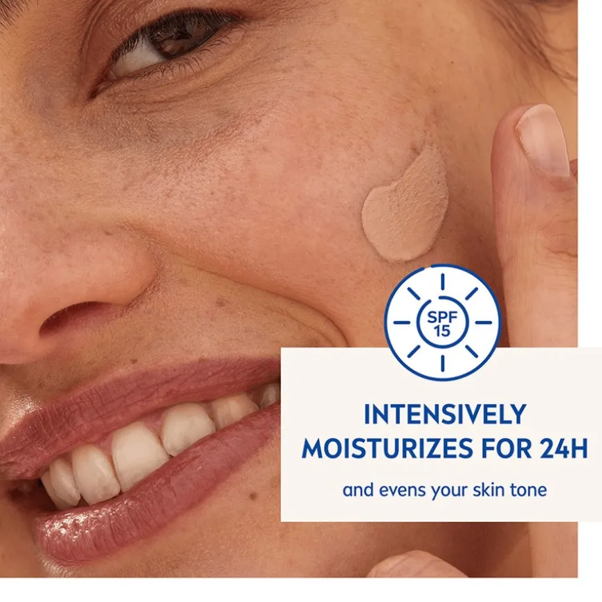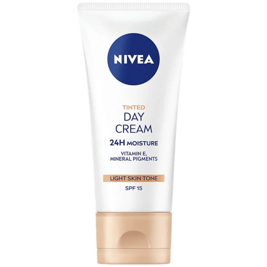 NIVEA Tinted Day Cream Light er en farget dagkrem med vitamin E og mineralpigmenter som tilfører huden intensiv fuktighetspleie i opptil 24 timer og gjenoppretter hudens fuktighetsbalanse. Den fargede ansiktskremen er velegnet til lyse hudtoner og dekker ujevnheter. Den jevner ut hudtonen og gir en naturlig strålende hud. Denne dagkremen inneholder også SPF15, som beskytter mot solens farlige stråler. Den silkeglatte formulaen tilfører fuktighetspleie og gjør huden myk og strålende hver dag! NIVEA Tinted Day Cream Light er dermatologisk testet og velegnet til alle hudtyper, og den har en vegansk formula – uten animalske ingredienser. Prøv nå og opplev fuktighetspleiet og myk hud! Unngå direkte kontakt med øynene.