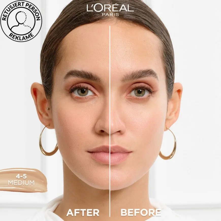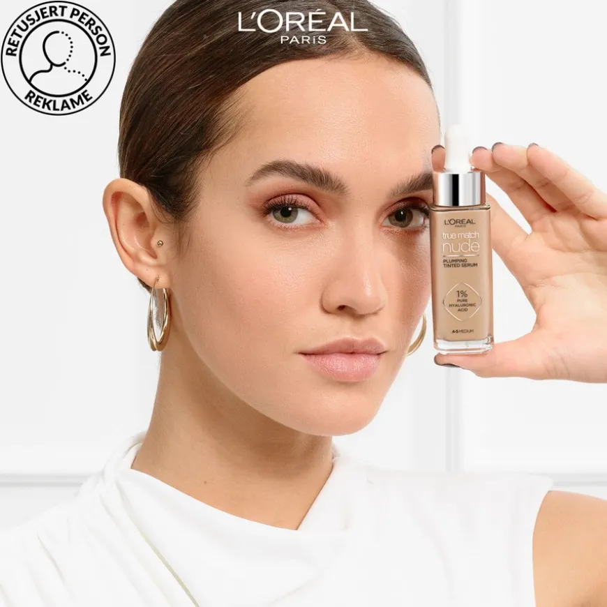 L’Oréal Paris True Match Nude Plumping Tinted Serum er et parfymefritt foundation serum med lett dekkevne for en nude look som dekker ujevnheter uten å tette porene. En formel med mineralpigment, glyserin, 1 % hyaluronsyre gir huden langvarig fuktighet og gjør den fyldig og naturlig strålende. På 1 time er huden 24 %* mer fuktet og synlig fyldigere. Vegansk formel**. Passer alle hudtyper, også sensitiv. Testet under dermatologisk kontroll.