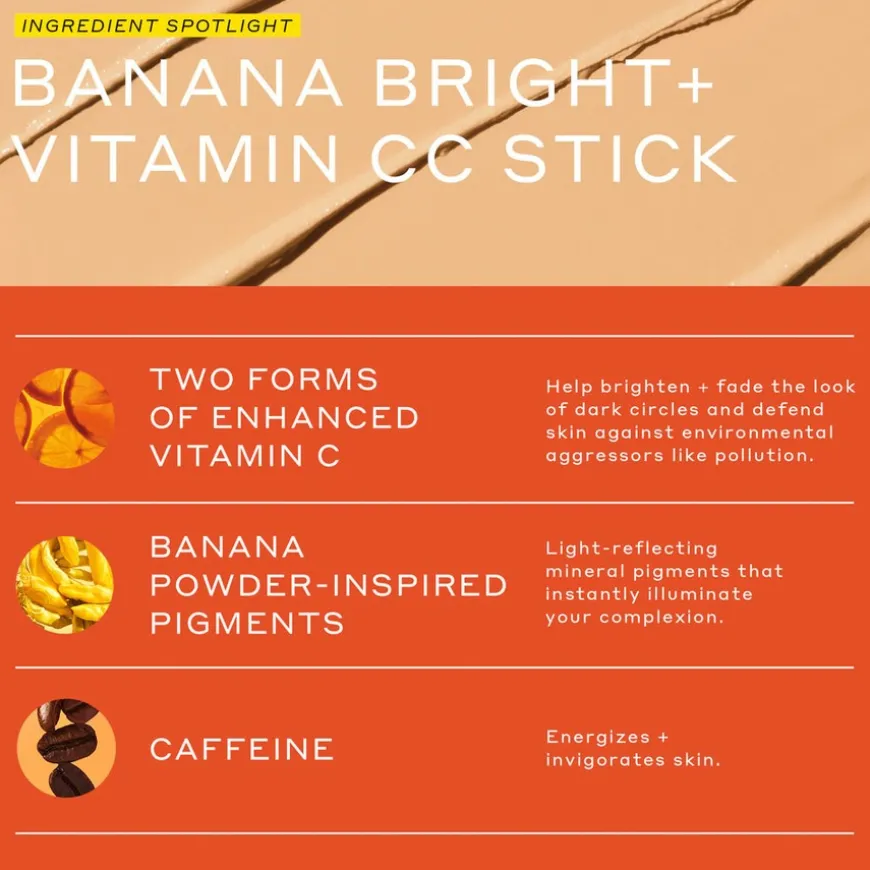 Banana Bright+ Vitamin CC Sticks gir en umiddelbar effekt – den lysner opp, fukter og nøytraliserer til og med de vanskeligste mørke ringer under øynene. Formelen er laget med to former forsterket C-vitamin, energigivende koffein og lysnende pigment for å øyeblikkelig lysne og minimere synligheten av mørke ringer og misfargninger i huden. Disse CC Sticks kommer i tre fleksible nyanser som kan brukes av alle – enten alene, under concealeren eller over sminken.