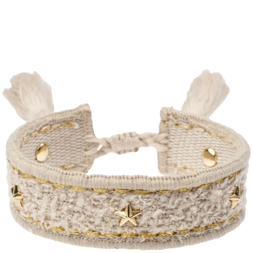 Tweed Friendship Bracelet With Star Studs er et unikt og stilfullt armbånd laget av mykt tweedstoff, dekorert med små stjernestuds som gir det et lekent og elegant uttrykk. Dette vennskapsarmbåndet er justerbart og komfortabelt å bruke, og det er perfekt som en gave til en venn eller som et statement-tilbehør. Tweedmaterialet gir en sofistikert touch, mens stjernedetaljene tilfører litt ekstra personlighet og stil.