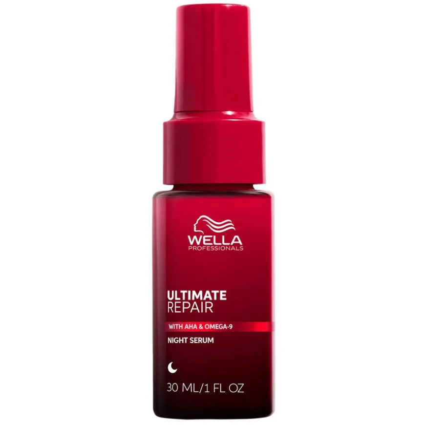 Wella Professionals Ultimate Repair Night Serum er et leave-in serum til natten som synlig korrigerer matthet, tørrhet og brudd. Leave-in-formelen inneholder omega-9 for intensiv fuktighet og forsvarspolymerer som bidrar til å beskytte håret mot nattlige stressfaktorer ved å skape et usynlig skjold. Med AHA, som vanligvis er kjent innen hudpleie, brukes AHA i Ultimate Repair til å styrke, pleie og forhindre brudd i sunt og kjemisk behandlet hår ved å gjenoppbygge hydrogenbindingene og trenge inn i hårfibrene i dybden. Alt dette bidrar til å reparere skadet hår over natten og gi det næring i opptil 8 timer.