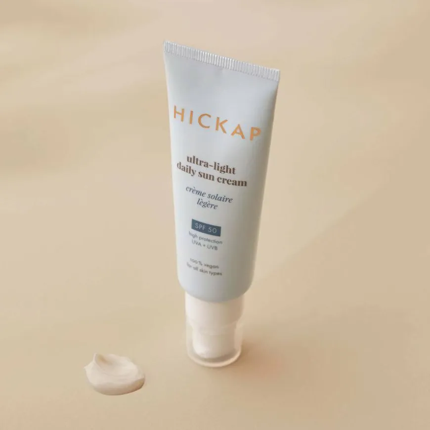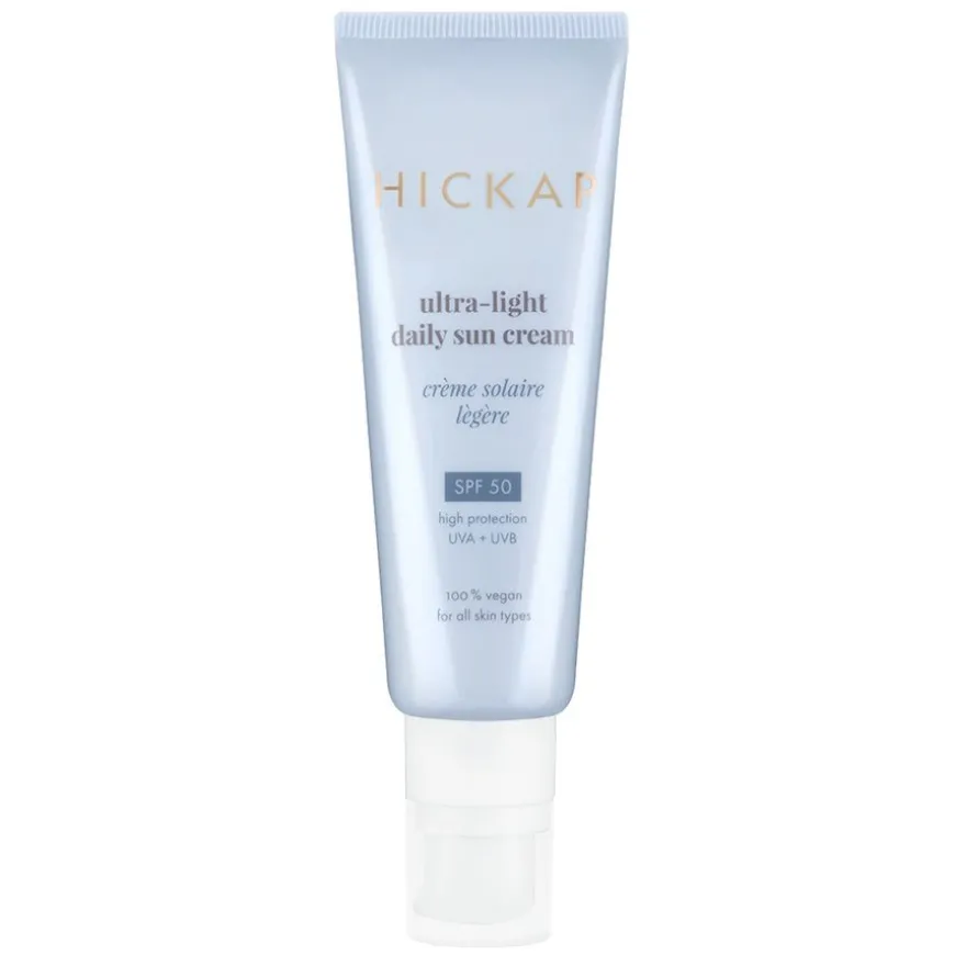 Ultra-Light Daily Sun Cream SPF50 er en intenst fuktighetsgivende og pleiende dagkrem med SPF 50 som beskytter mot et bredt spekter av solstråler (UVA/UVB). Hickap har også lastet den full av aktive ingredienser og antioksidanter som fukter og beskytter huden mot ytre angrep. På denne måten har Hickap skapt en krem som både pleier huden og beskytter mot solen: et superfleksibelt alt-i-ett produkt som samtidig fungerer som en god dagkrem og en solbeskyttelsesfaktor. Du trenger ikke velge. Bruk den på stranden som strand-SPF eller i byen som en fantastisk fuktighetsgivende dagkrem som beskytter mot sol og dårlig luft som stresser huden. Den fjæraktige teksturen absorberes raskt og gjør påføringen supermyk.