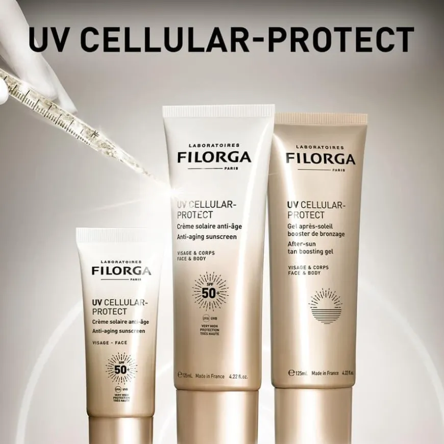 UV Cellular-Protect Anti-Aging Sunscreen Face SPF50+ er en avansert, vannresistent solkrem utviklet av Laboratoires Filorga for å beskytte huden mot solens skadelige stråler og samtidig redusere tegn på fotoaldring. Den lette, ikke-fete formelen trekker raskt inn i huden uten å etterlate en hvit hinne. Produktet gir bredspektret UVA/UVB-beskyttelse gjennom 3 organiske UV-filtre og inneholder 8 % aktive anti-age-ingredienser – inkludert peptider, niacinamid, hyaluronsyre og NCEF 2.0-kompleks – som forbedrer hudens fasthet, jevner ut hudtonen og reduserer mørke flekker. Den korallvennlige formelen er testet in vitro på havorganismer, består av 71 % ingredienser av naturlig opprinnelse, og passer for alle hudtyper. Kliniske tester viser at huden føles glattere og fastere, og at nye pigmentflekker forebygges.