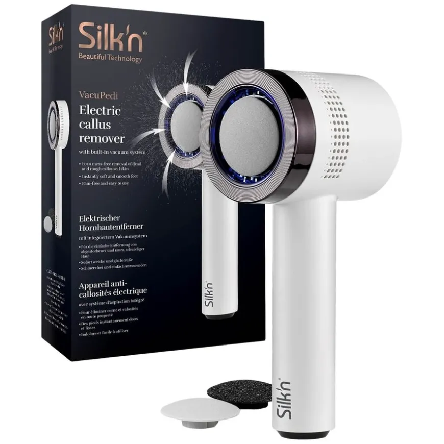 VacuPedi Callus Remover er en elektrisk callusfjerner med vakuumsystem. Gled deg over velstelte, myke føtter på sekunder med Silk’n VacuPedi. Denne smarte elektriske fjerneren for hard hud fungerer med roterende slipeskiver og et innebygd vakuumsystem. Den enkle og problemfrie måten å fjerne hard hud på. Og enda viktigere, det blir ikke noe rot!