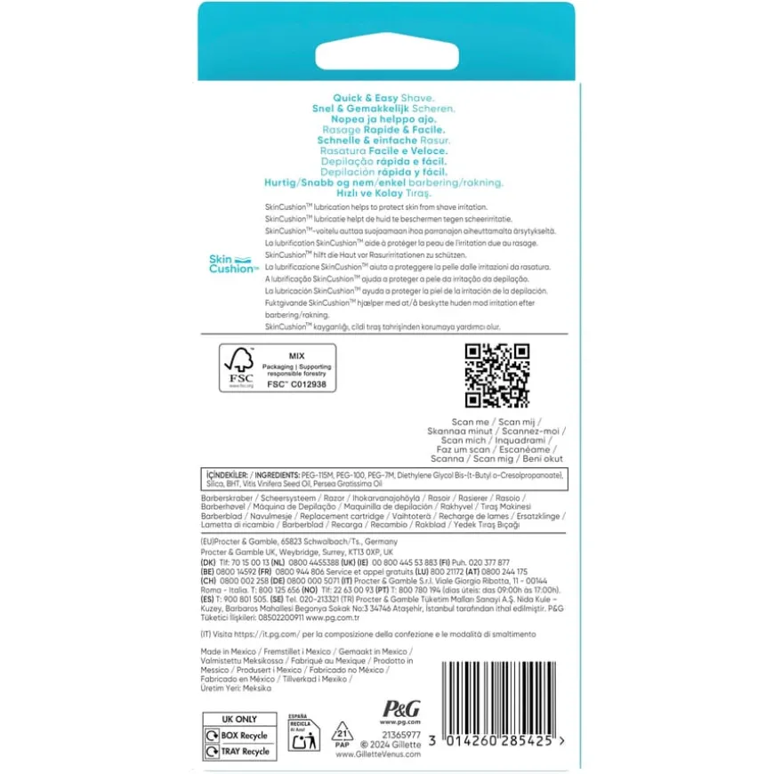 Venus Smooth For Women Razor er en barberhøvel designet for kvinner som ønsker en rask, enkel og tett barbering. Den har 3 ultraskarpe blader og en SkinCushion-smørestripe med en touch av aloe som bidrar til å beskytte huden mot irritasjon. Høvelen har et solid, sklisikkert håndtak for trygg og kontrollert barbering, og det kompakte, dreibare hodet tilpasser seg konturene i kroppen, også på mindre områder. Den gjenbrukbare høvelen er kompatibel med alle Venus-bladrefiller (unntatt Simply Venus og Venus Pubic Hair & Skin), noe som gjør den til en praktisk og rimelig løsning for daglig pleie. Ideell for alle hudtyper, inkludert sensitiv hud.