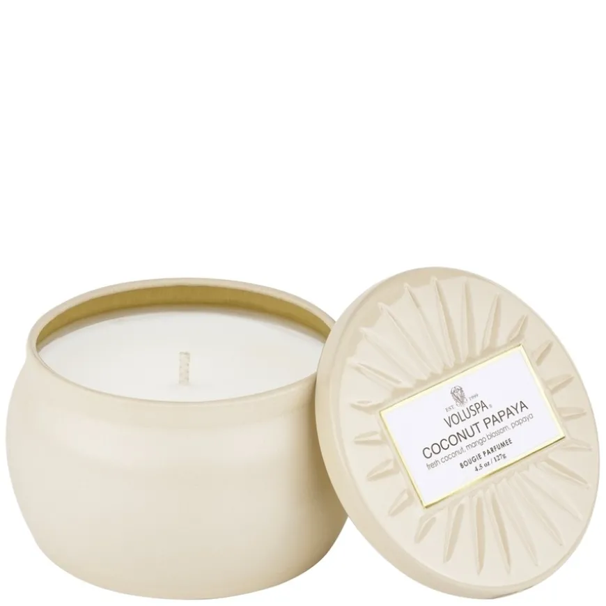 Vermeil Collection Mini Tin Candle i duften Coconut Papaya fra Voluspa er et tropisk og eksotisk duftlys. Med den kremete aromaen av fersk kokos kombinert med den søte og fruktige duften av moden papaya, skaper det en varm og avslappende atmosfære. Lyset er laget med kokosvoks for en ren og jevn brenning og leveres i en praktisk, dekorativ metallboks som er ideell for reise eller små rom. Perfekt for de som elsker varme, tropiske dufter.
