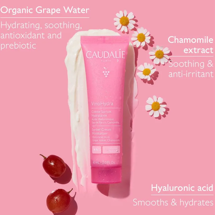 VinoHydra Sorbet Cream Moisturizer er en ansiktskrem som hydrerer og regenererer kompromittert hud. Ved påføring reduserer den hudens sensitivitet og rødhet. Teksturen er kjølig som en sorbet, superlett og smelter øyeblikkelig inn i huden, noe som gjør den ideell for normal hud, selv sensitiv. Takket være sin «quick break»-teknologi, forvandles denne gel-kremen ved kontakt med huden til en vannpatch som beroliger, hydrerer og styrker huden. Produktet er egnet for normal hud.
