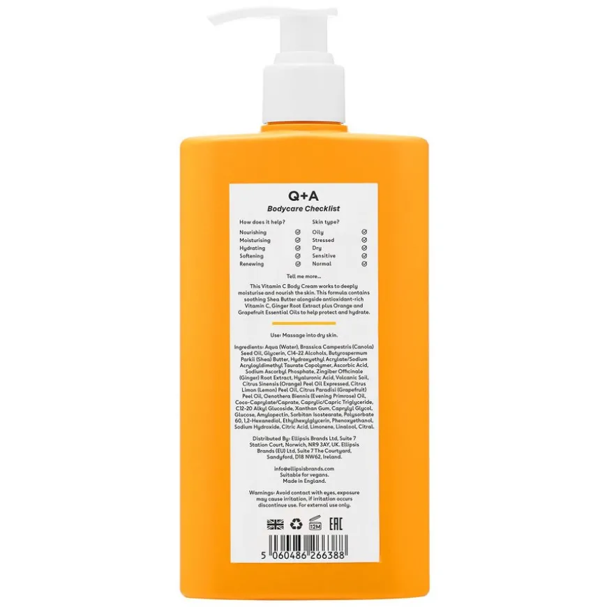 Aqua (Water), Brassica Campestris (Canola) Seed Oil, Glycerin, C14-22 Alcohols, Butyrospermum Parkii (Shea) Butter, Hydroxyethyl Acrylate/Sodium Acryloyldimethyl Taurate Copolymer, Ascorbic Acid, Sodium Ascorbyl Phosphate, Zingiber Officinale (Ginger) Root Extract, Hyaluronic Acid, Volcanic Soil, Citrus Sinensis (Orange) Peel Oil Expressed, Citrus Limon (Lemon) Peel Oil, Citrus Paradisi (Grapefruit) Peel Oil, Oenothera Biennis (Evening Primrose) Oil, Coco-Caprylate/Caprate, Caprylic/Capric Triglyceride, C12-20 Alkyl Glucoside, Xanthan Gum, Caprylyl Glycol, Glucose, Amylopectin, Sorbitan Isostearate, Polysorbate 60, 1,2-Hexanediol, Ethylhexylglycerin, Phenoxyethanol, Sodium Hydroxide, Citric Acid, Limonene, Linalool, Citral.