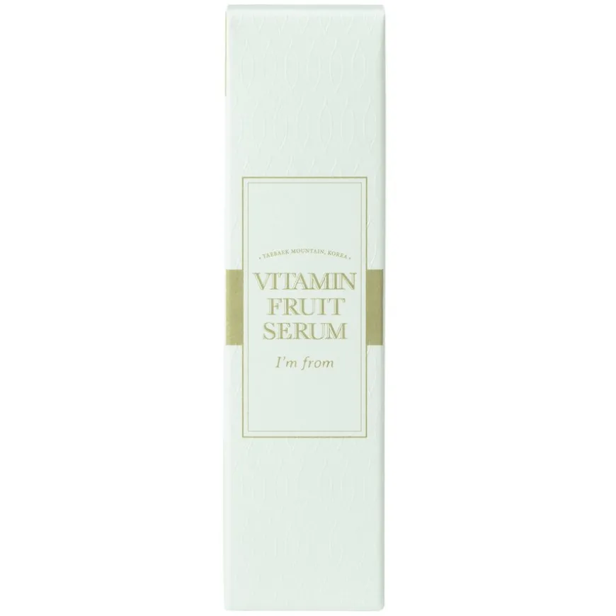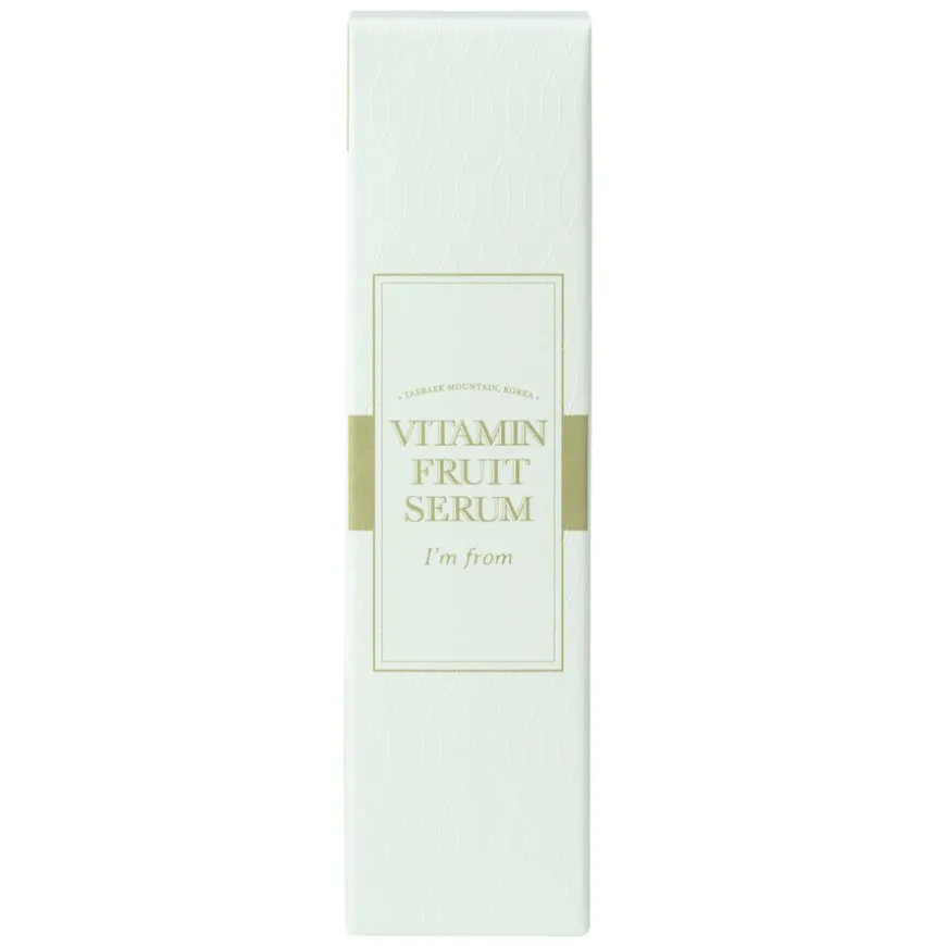 I’m from Vitamin Fruit Serum er et serum som inneholder 74% tindved, i tillegg til en høy kosentrasjon C vitamin fra ulike frukter. Serumet gir huden en sunn glød og fuktighet, samtidig som den forebygger og forbedrer urenheter og pigmentflekker. (Multivitaminpleie) Serumet har fanget opp de rene vitaminene fra den vitaminrike supermaten ‘Vitamin Fruit’ ved hjelp av en unik kaldpressmetode. Det bruker naturlig fremstilte vitaminer med opptil 3,94 ganger høyere absorpsjonsrate enn syntetiske vitaminer, noe som gjør at serumet absorberes raskt, uten å føles klissete. Produktet har en naturlig gulfarge fra tindved-ekstrakt.