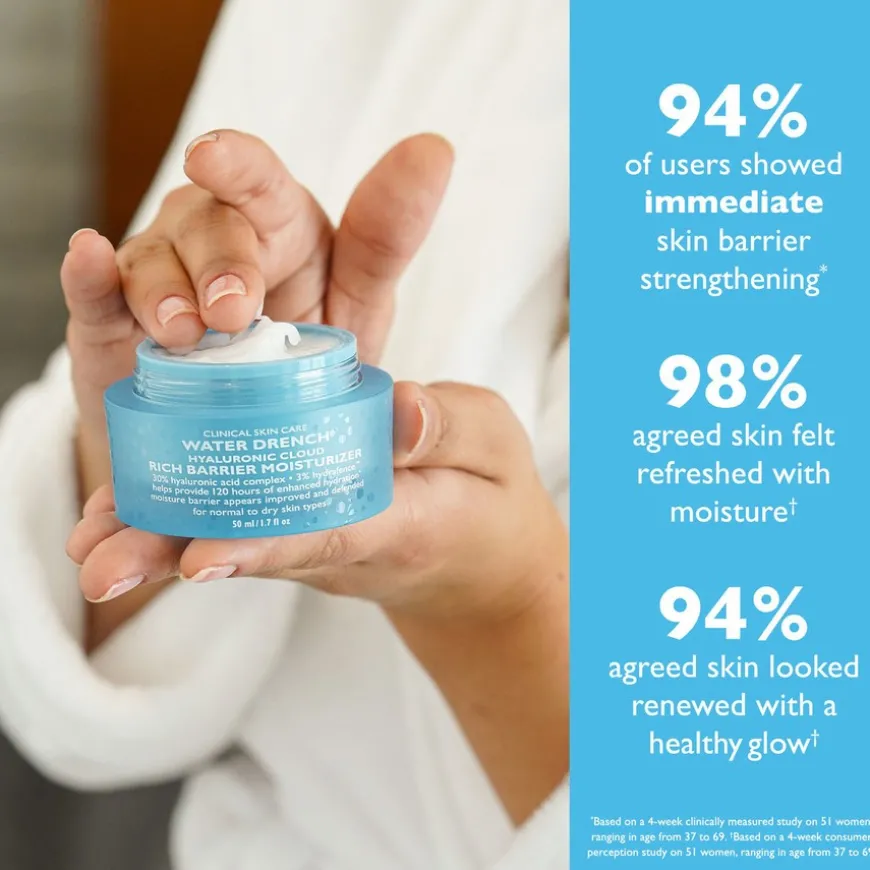 Water Drench Rich Berrier Moist er fuktighetskremen som kan styrke hudbarrieren og gi huden fukt. Opplev opp til 120 timer forbedret hydrering, takket være 3% HydraFenceTM*. Tegn til tørrhet, fine linjer og rynker blir redusert. Samtidig etterlater den en fuktig, sunn og ungdommelig hud. For de med normal til tørr hudtype.