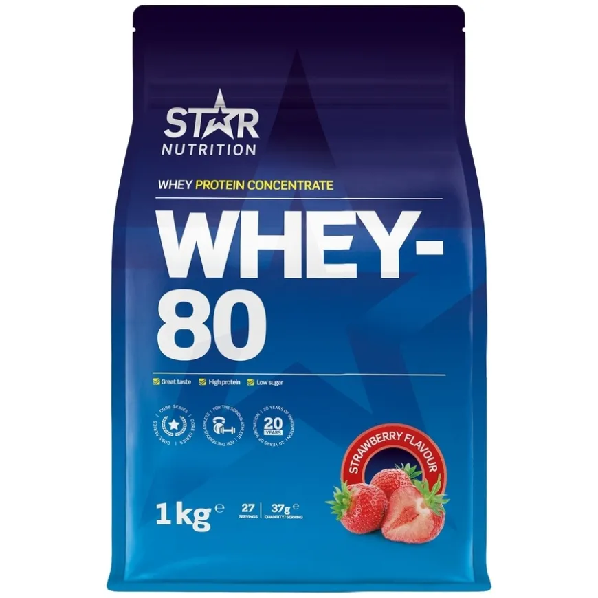 Whey-80 fra Star Nutrition er et komplett proteinpulver som er tilpasset deg som driver med idrett, bygger muskler eller vil forbrenne fett på en mer effektiv måte! Nord-Europas mest solgte protein takket være høy kvalitet, gode smaker og effekt.