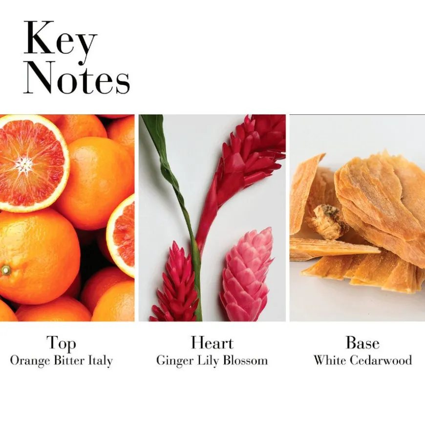 White Tea Ginger Lily fremkaller et varmt øyeblikk og gir samtidig energi og overrasker med en uventet tvist. Duften er sammensatt for å ta deg med på et eventyr med skjønne duftnoter av ingefærblomst, italiensk mandarin og bergamot. Noter av hvit te og sedertre fullfører duften og inspirerer til personlig refleksjon, nytelse og velvære. En innbydende, varm og samtidig frisk duft.