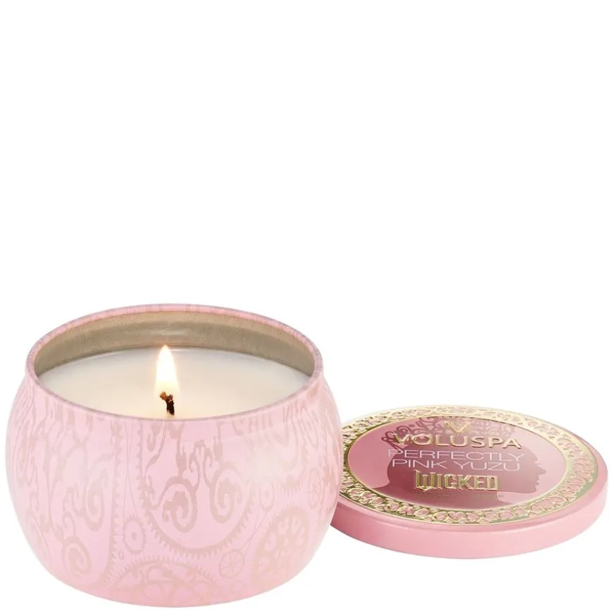 Perfectly Pink Yuzu Mini Tin Candle er et Limited Edition-duftlys fra Voluspa inspirert av Glinda fra musikalen Wicked. Duftlyset skaper en frisk, fruktig og oppløftende atmosfære med en sofistikert blanding av rosa yuzu, fersken, grapefrukt og glitrende havsalt i toppnotene. I hjertet finner du florale noter av jasmin og sukkerfiol, mens vaniljebobler runder av duften med en kremet sødme. Laget med Voluspas proprietære kokosvoksblanding som sikrer ren forbrenning og optimal duftspredning. Lyset har én 100 % naturlig veke og en brennetid på omtrent 25 timer. Med sitt kompakte design og bærekraftige produksjon er det perfekt for mindre rom eller som gave til duftelskere.