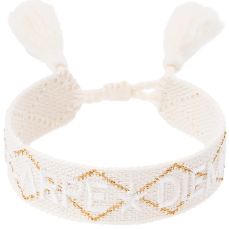 Woven Friendship Bracelet er et vevet armbånd laget av bomull dekorert med teksten «Carpe Diem».