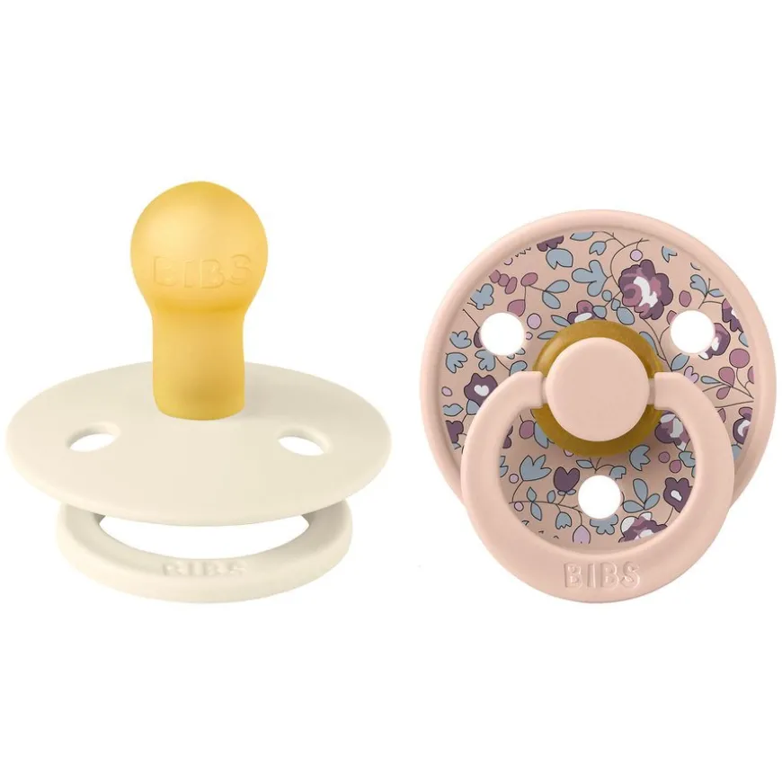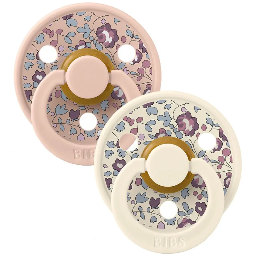 Pacifier Colour Latex er to smokker med rund sugedel i naturgummi. Den har det karakteristiske runde BIBS-skjoldet med tre ventilasjonsåpninger og en rund BIBS-gravert håndtakring.