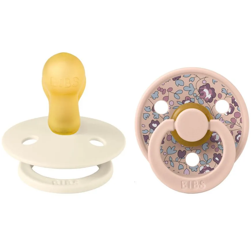 Pacifier Colour Latex er to smokker med rund sugedel i naturgummi. Den har det karakteristiske runde BIBS-skjoldet med tre ventilasjonsåpninger og en rund BIBS-gravert håndtakring.