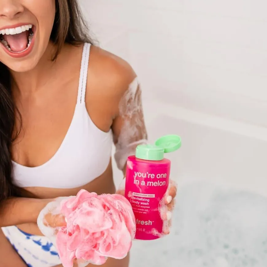 You’re One In A Melon Revitalizing Body Wash er en revitaliserende dusjsåpe formulert med en kraftig blanding av fruktenzymer som skånsomt eksfolierer huden og gir en frisk følelse. Den inneholder plante- og mineralbaserte ingredienser som renser huden naturlig og effektivt, samtidig som den etterlater en søt og forfriskende duft av vannmelon og mint. Den lette gelteksturen skummer godt og passer perfekt for daglig bruk. Produktet er 100% vegansk og fritt for parabener, og egner seg for alle hudtyper, spesielt for hud som trenger oppfriskning og glød.