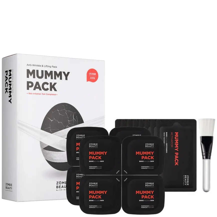 Mummy Pack & Activator Kit er en alt-i-en ansiktsbehandlingsmaske som gir umiddelbar synlig effekt av rynkefjerning, økt elastisitet, og glatt hud. Løftemaske for hjemmebruk for samtidig diagnostisering og forbedring av hudproblemer. Holder huden sunn og elastisk ved å hindre hudens aldring, slapphet, og begynnende rynker. Svart trøffelekstrakt og svartmat som inneholder rikelige mengder antocyanin for ekstra næring. Rengjør og strammer huden med kullpulver for rensing.