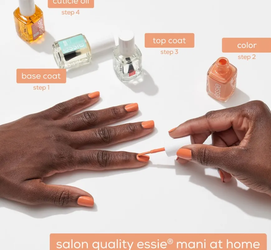 - For best resultat påfør en dråpe med Essie Apricot Cuticle Oil på hver negl for å myke opp neglebåndet. Tørk forsiktig av slik at det ikke er igjen rester av olje på neglene.