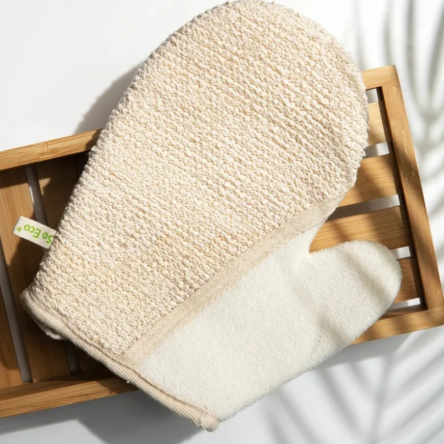 2 In 1 Exfoliating Glove er en flerfunksjonellhanske med to sider, en side med tekstur for å eksfoliere og fjerne døde hudceller og en jevnere bomullsside som hjelper til med å skumme produkter på huden for en supermyk finish.