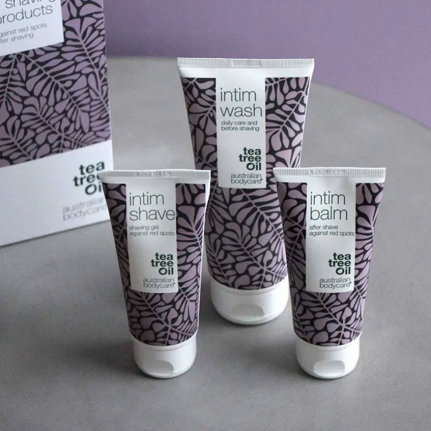 Pakken til intimbarbering inneholder Intim Wash, Intim Shave og Intim Balm med tetreolje som effektivt renser huden og sikrer en pen intimbarbering, uten røde nupper, barberingsutslett eller inngrodde hår.