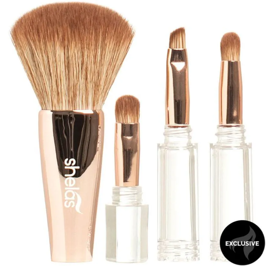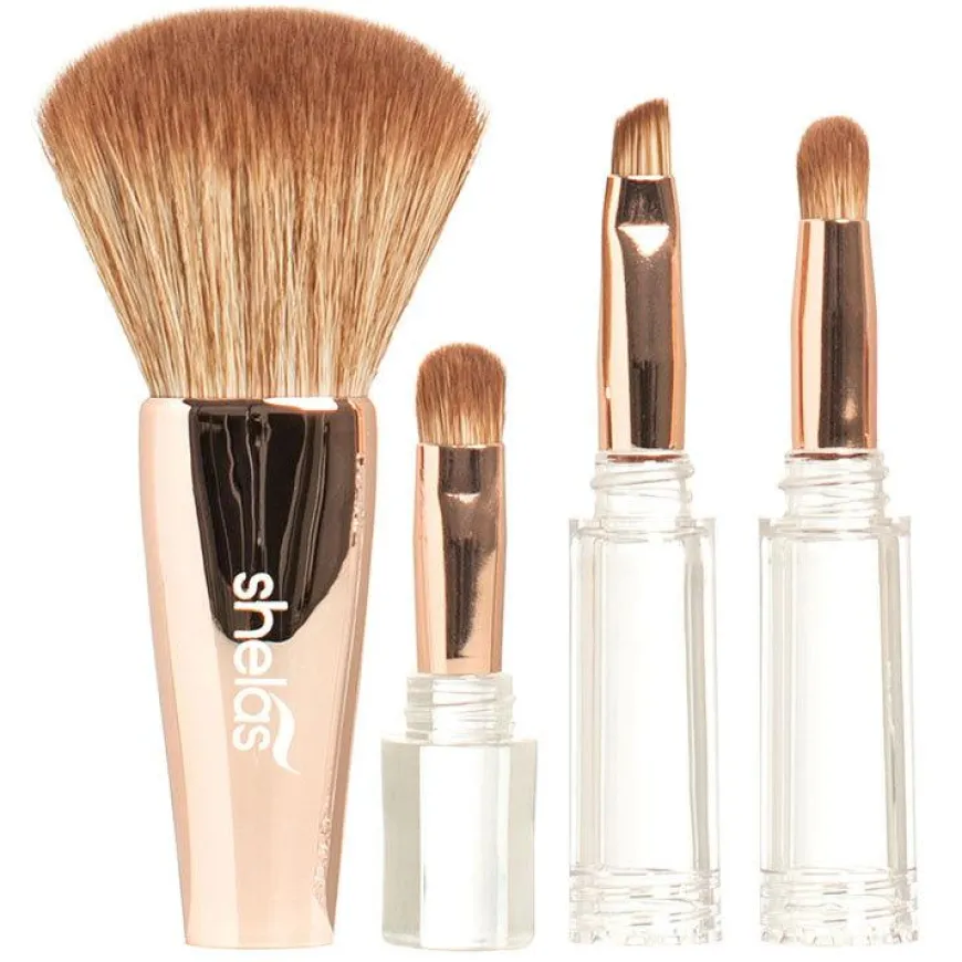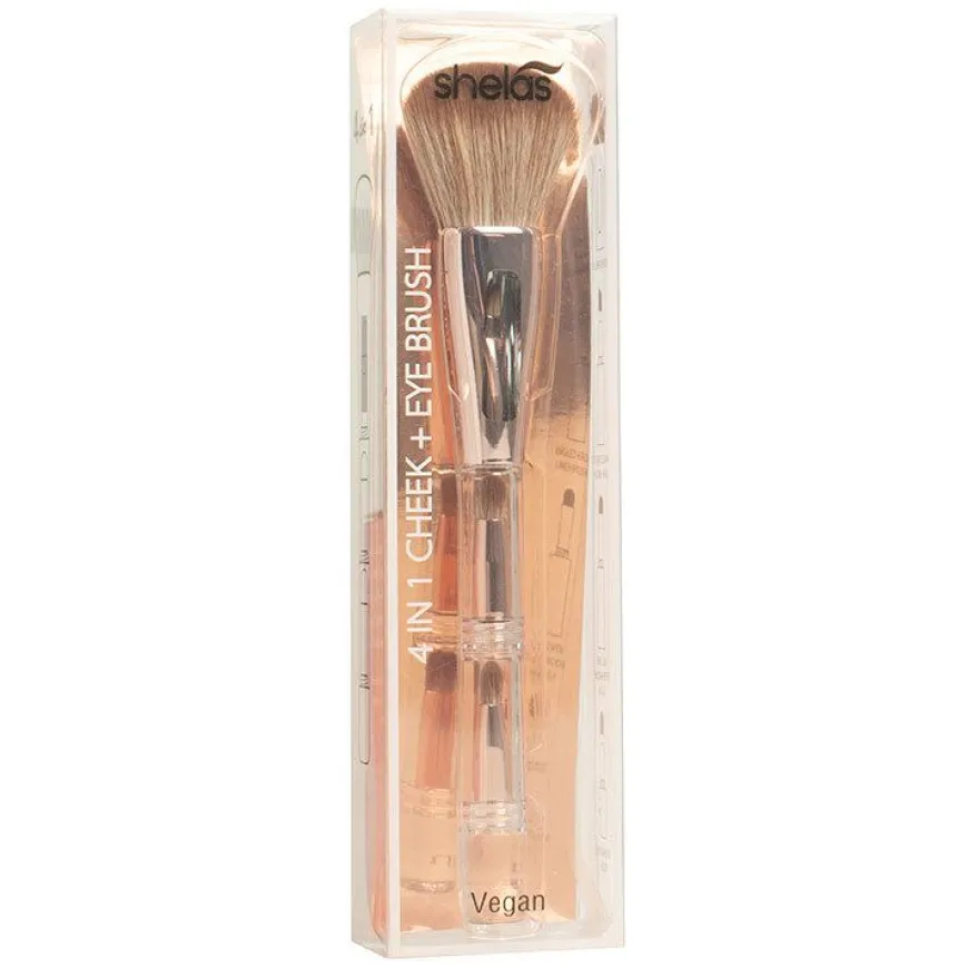 4 In 1 Cheeek + Eye Brush Set er et sminkeverktøysett som inneholder 1 verktøy og 4 essensielle ansiktsbørster. Det er enkelt å ha med seg på reise eller jobb. Kostene erutmerket til å påføre alle typer ansikt- og øyensminke. Produktet er vegansk og uten latex.