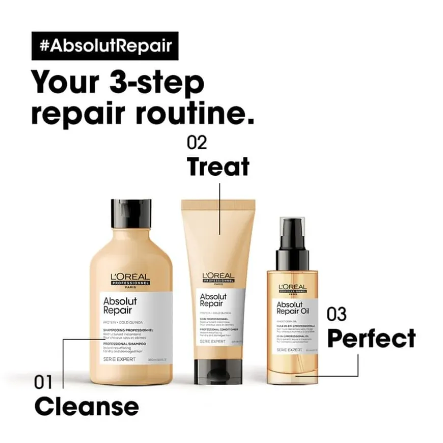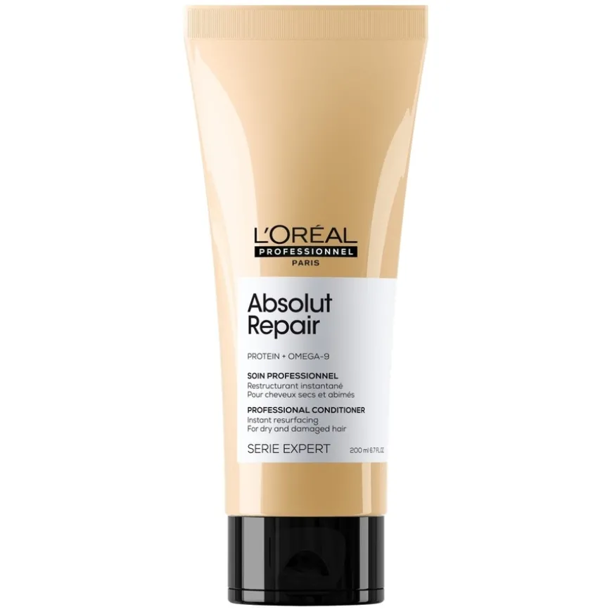 L’Oréal Professionnel Série Expert Absolut Repair Gold Conditioner reparerer håret øyeblikkelig*, til tørt og skadet hår. Balsamen er beriket med et derivat av hveteprotein og frøekstrakt av gyllen quinoa. Den kombinerer intens reparation med en fjerlett følelse i håret. Håret blir øyeblikkelig transformeret: håret får mer modstandskraft, blir mykere og glansfult.