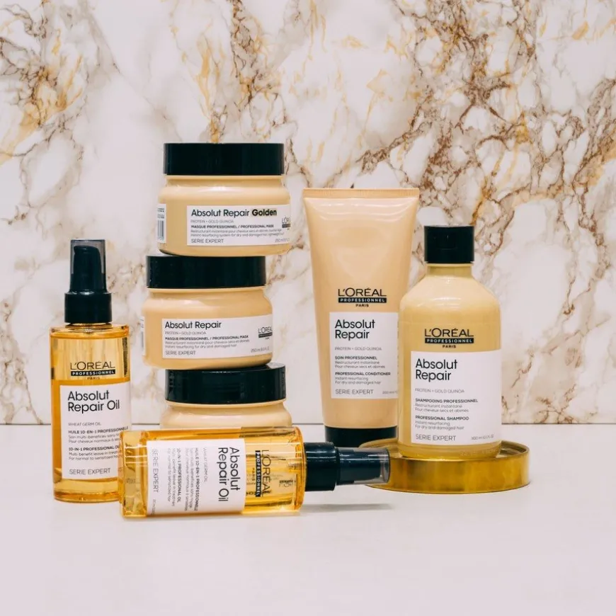 Série Expert Absolut Repair Golden Masque er en gyllen hårmaske som repererer håret øyeblikkelig*, til tørt og skadet hår. Masken er beriket med derivat av hveteprotein og frøekstrakt af gyllen quinoa, for øyeblikkelig reperasjon av hårfibere med en fjerlett følelse i håret. Håret blir øyeblikkelig transformert: håret blir glattere, mykere og glansfult. Etterlater ingen produktrester på hårfiberene.