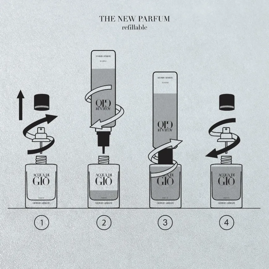 En kostbarhet som kommer til syne i designet av den etterfyllbare flasken, som har et slimt design og maskulin form og er fremstilt i nyanser av gradert sort. Acqua di Giò Parfum-flasken kan etterfylles, noe som understreker merkets miljøforpliktelser.