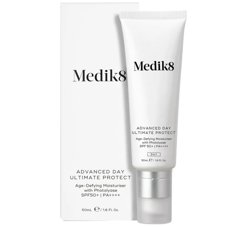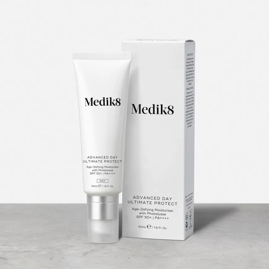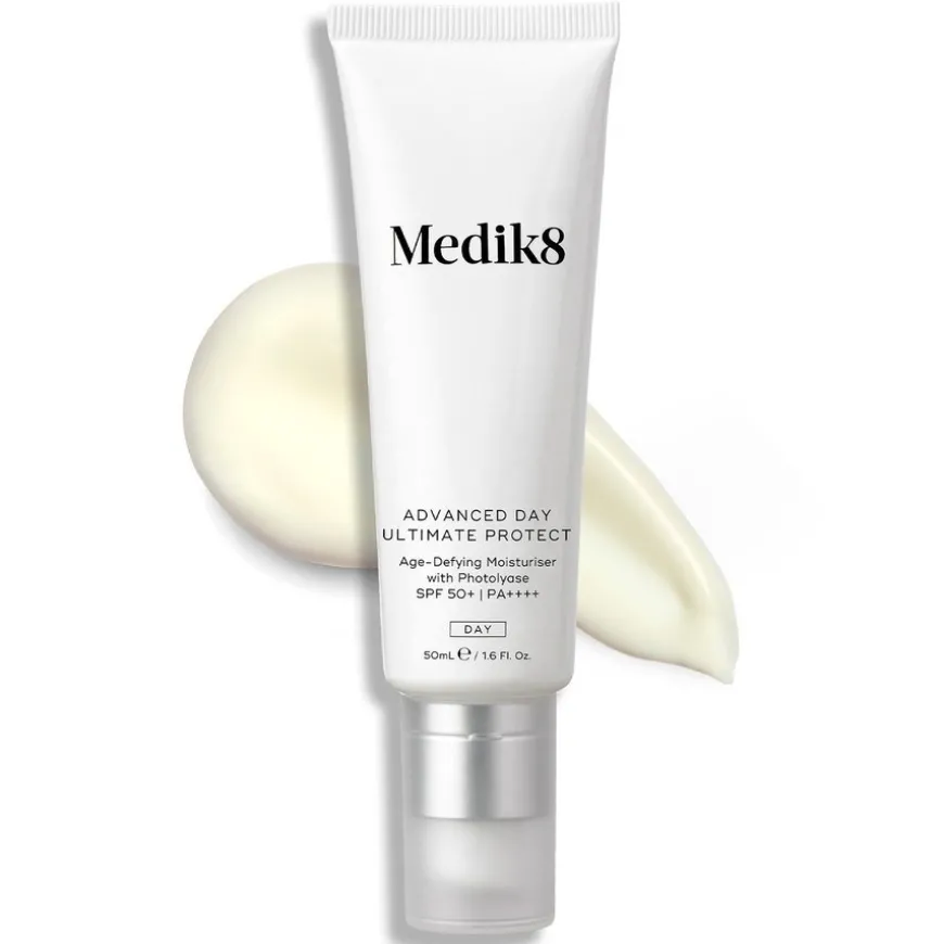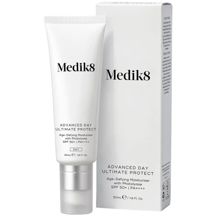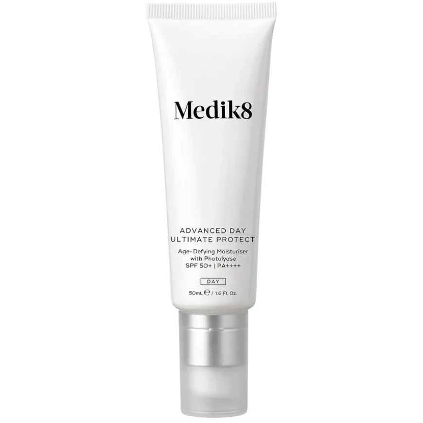 Advanced Day Ultimate Protect SPF50+ er den ultimate dagkremen fra Medik8 som inneholder høyt bredspektret SPF 50+ PA ++++ UVA / UVB-beskyttelse, av moderne avanserte solbeskyttelsesfiltre, kombinert med optimal miljøvern. Inneholder et DNA-reparerende enzym som hjelper hudens naturlige reparasjonsevne. Nydelig tekstur som raskt trenger inn i huden. Passer for alle som ønsker solkrem med høyt filter i dagkremen og de med tørr eller veldig tørr hud. Vegansk.