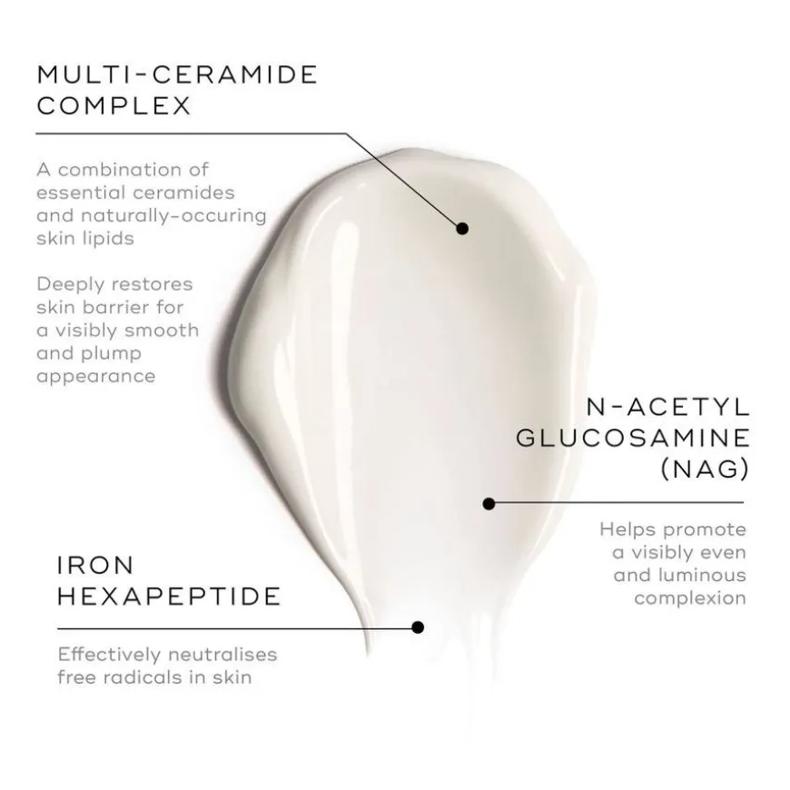 Aqua (Water), Squalane, Caprylic/Capric Triglyceride, Dimethicone, Glycerin, Stearic Acid, Phytosterols, Propylene Glycol, C12-16 Alcohols, Sodium Acrylate/Sodium Acryloyldimethyl Taurate Copolymer, Cetearyl Alcohol, Palmitic Acid, Ceramide NP, Cetearyl Olivate, Linoleic Acid, Behenyl Alcohol, Hydrogenated Lecithin, Tocopheryl Acetate, Sorbitan Olivate, Phenoxyethanol, Benzyl Alcohol, Amelanchier Alnifolia (Saskatoon) Fruit Extract, Ethylhexylglycerin, Acetyl Glucosamine, Citric Acid, Sorbitol, Rosmarinus Officinalis (Rosemary) Leaf Oil, Citrus Aurantium Amara Flower Oil, Lavandula Angustifolia (Lavender) Herb Oil, Citrus Aurantium Dulcis (Orange) Peel Oil, Hylocereus Undatus (Dragon Fruit) Fruit Extract, Dehydroacetic Acid, Tremella Fuciformis (Snow Mushroom) Extract, Sodium Lauroyl Lactylate, Anthemis Nobilis (Chamomile) Flower Oil, Pogostemon Cablin (Patchouli) Leaf Oil, Vetiveria Zizanoides (Vetiver) Root Oil, Ascorbic Acid, Disodium EDTA, Ceramide AP, Ceteareth-25, Phytosphingosine, Cholesterol, Xanthan Gum, Carbomer, Cetyl Alcohol, Behenic Acid, Ceramide NS, Ferric Hexapeptide-35, Ceramide EOP, Ceramide EOS, Caprooyl Phytosphingosine, Caprooyl Sphingosine, Ascorbyl Palmitate, Tocopherol, Geraniol, Limonene, Linalool.