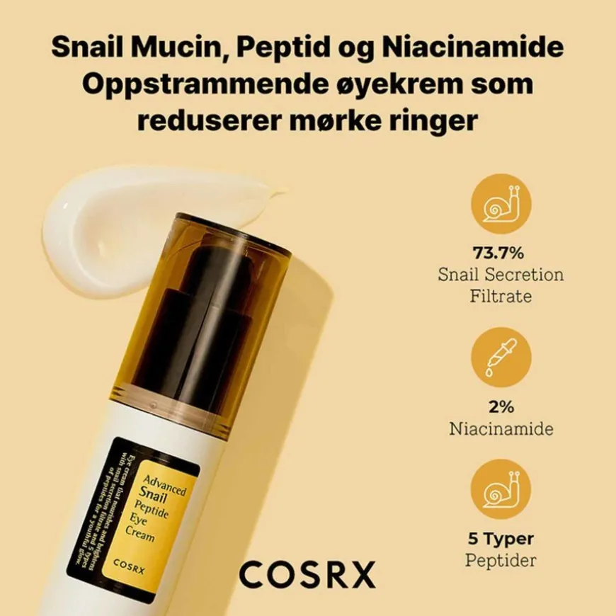 Øyekremen er formulert med filtrert sneglesekret, også kjent som snegleslim, som virker oppstrammende og reduserer mørke ringer.