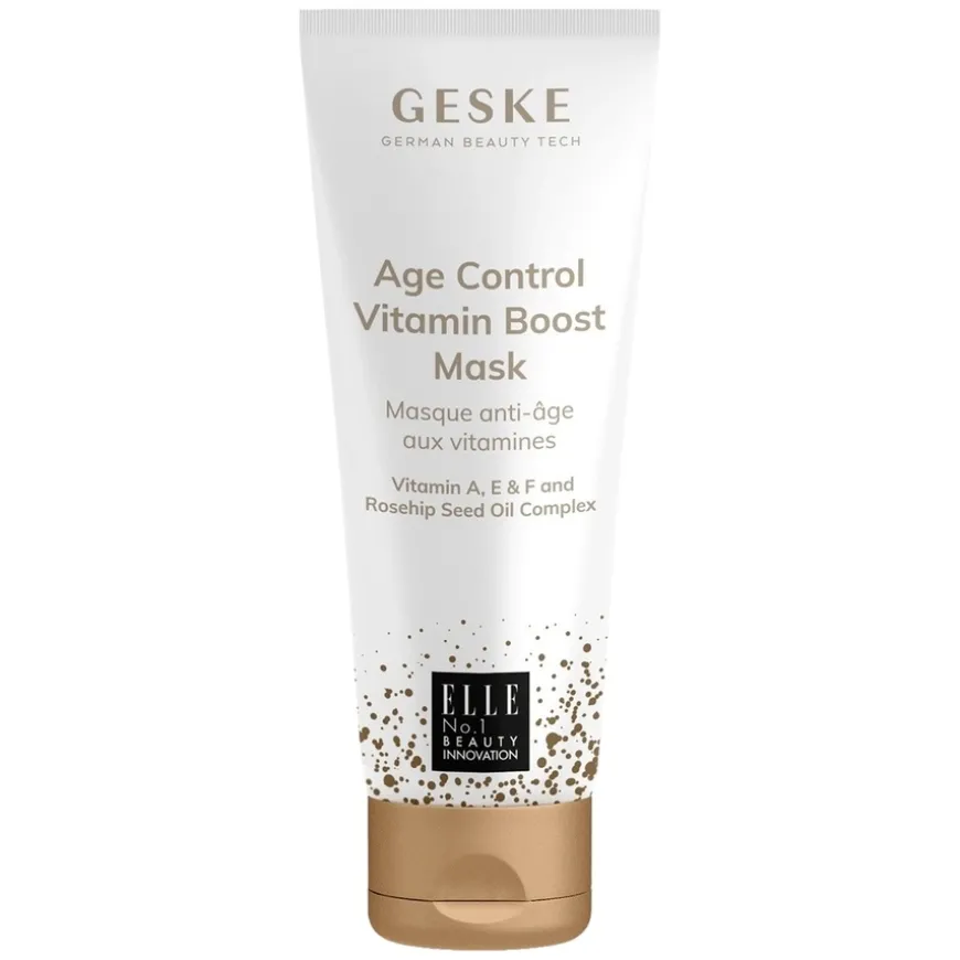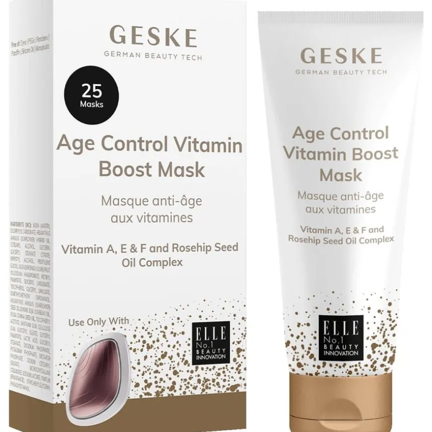 Age Control Vitamin Boost Mask er en nattmaske som pleier huden intensivt mens du sover. Masken er formulert med antioksidantrike ingredienser som vitamin E og A, samt næringsrik avokado- og mandelolje, som sammen støtter hudens regenerering og motvirker tegn på aldring. Den styrker hudbarrieren, jevner ut hudtonen og gir fukt og næring i dybden. Masken passer for alle hudtyper, spesielt tørr, moden eller sliten hud som trenger et løft. Brukes ideelt sammen med GESKEs SmartAppGuided™ skjønnhetsapparater for optimal effekt og absorpsjon.