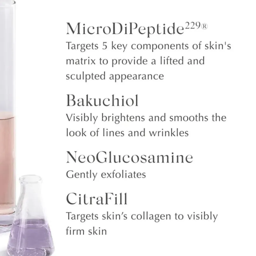 Aqua/Water/Eau, Acetyl Glucosamine, Triethyl Citrate, C12-15 Alkyl Benzoate, Butyrospermum Parkii (Shea) Butter, Glycerin, C10-18 Triglycerides, Butylene Glycol, PPG-3 Benzyl Ether Myristate, Behenyl Alcohol, Isocetyl Stearoyl Stearate, Cetearyl Alcohol, PEG-100 Stearate, Glyceryl Stearate, Ethoxydiglycol, Glyceryl Dilaurate, Bakuchiol, Acetyl Dipeptide-31 Amide, Palmitoyl Glycine, Tocopheryl Acetate, Malus Domestica Fruit Cell Culture Extract, Lecithin, Pentaerythrityl Tetra-di-t-butyl Hydroxyhydrocinnamate, Sodium Bisulfite, Sodium Hydroxide, Disodium EDTA, Carbomer, Caprylyl Glycol, Xanthan Gum, Steareth-10, Phenoxyethanol, Chlorphenesin.