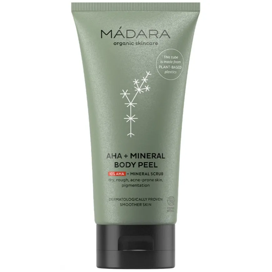 AHA+Mineral Body Peel er en sofistikerte kroppspeeling som forener hvit leire med AHA-fruktsyrer og mineralbaserte eksfolierende partikler, og feier bort døde og matte hudceller for å avdekke glattere, klarere hud.