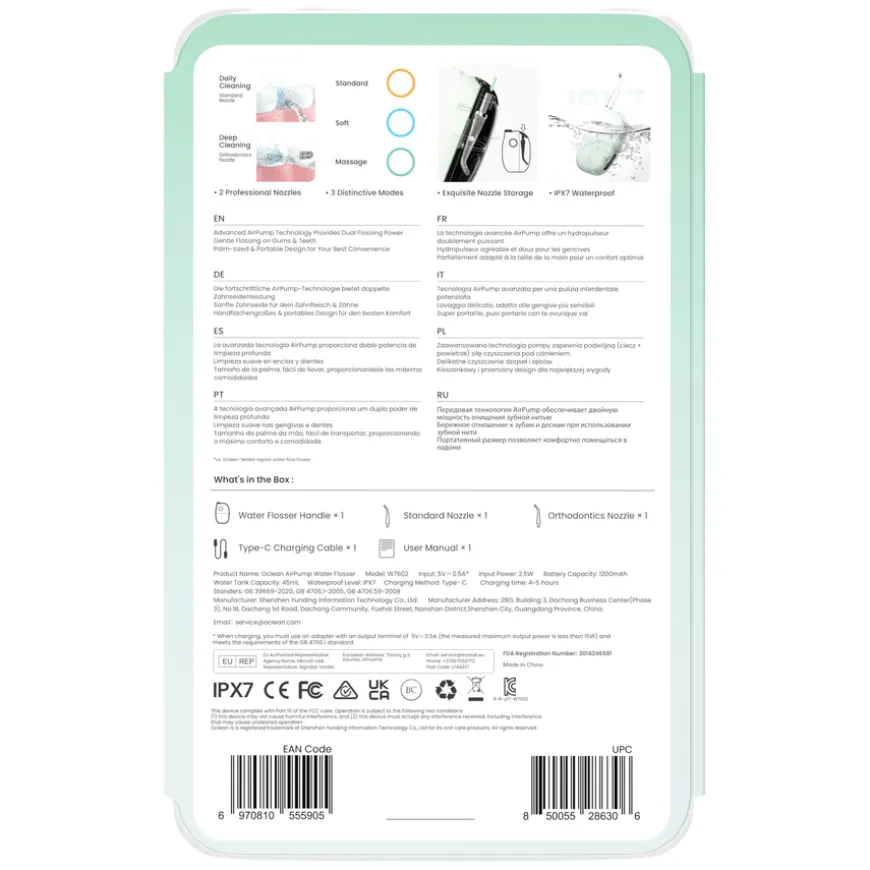 Med tre forskjellige flossmodus – standard, myk og massasje – kan du tilpasse rengjøringen etter dine spesifikke behov. En påfylling gir en grundig rengjøring, og 30 sekunder med 80 jets er tilstrekkelig for å rengjøre hele munnen. Den inkluderer to profesjonelle dyser, et elegant dyseoppbevaringsdesign, IPX7 vanntett beskyttelse, en sklisikker kropp, et kompakt og synlig reservoar, samt type-C lading.