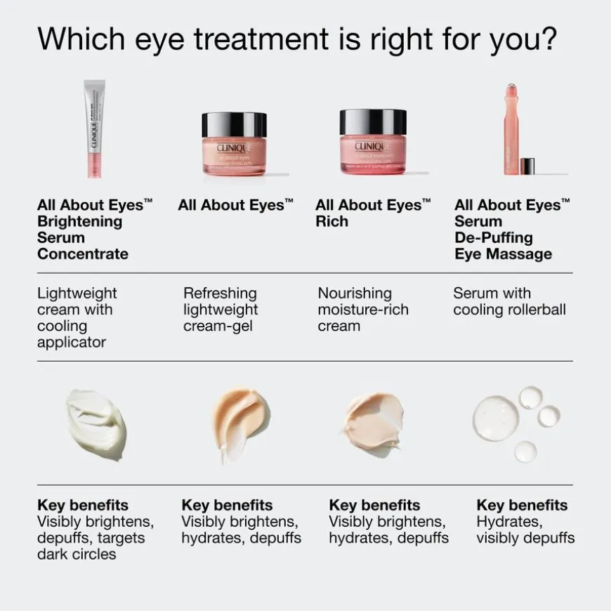 Instant Eye Brightener forbedrer utseendet på mørke ringer og hevelser rundt øynene. All About Eyes Brightening Serum Concentrate er et oppfriskende øyeserum beriket med en effektiv retinoid som likevel er skånsom nok for det sarte øyeområdet. Produktet leveres med en dermatologisk utviklet applikator som hjelper deg med å nå de små og vanskelige hjørnene nær og under øyet.