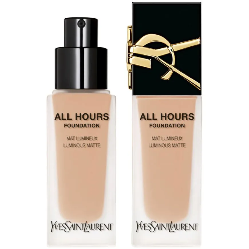 Yves Saint Laurent All Hours Foundation holder i 24 timer. Den føles ren og er beriket med hyaluronsyre. Produktet gir full dekning og gir en vektløs og pustende følelse. Opplev en ultrasanselig følelse av hud mot hud med jevn dekning, som om du hadde perfekt, naken hud. Den fukter huden hele dagen og pleier den – selv etter at du har fjernet den. Produktet smitter ikke av, er vannfast og svetteresistent.