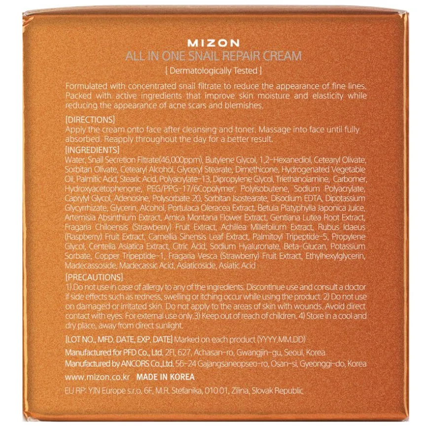 Aqua, Snail Secretion Filtrate, Butylene Glycol, 1,2-Hexanediol, Cetearyl Olivate, Sorbitan Olivate, Cetearyl Alcohol, Glyceryl Stearate, Dimethicone, Hydrogenated Vegetable Oil, Palmitic Acid, Stearic Acid, Polyacrylate-13, Dipropylene Glycol, Triethanolamine, Carbomer, Hydroxyacetophenone, Peg/Ppg-17/6 Copolymer, Polyisobutene, Sodium Polyacrylate, Caprylyl Glycol, Adenosine, Polysorbate 20, Sorbitan Isostearate, Disodium EDTA, Dipotassium Glycyrrhizate, Glycerin, Alcohol, Portulaca Oleracea Extract, Betula Platyphylla Japonica Juice, Artemisia Absinthium Extract, Arnica Montana Flower Extract, Gentiana Lutea Root Extract, Fragaria Chiloensis (Strawberry) Fruit Extract, Achillea Millefolium Extract, Rubus Idaeus (Raspberry) Fruit Extract, Camellia Sinensis Leaf Extract, Palmitoyl Tripeptide-5, Propylene Glycol, Centella Asiatica Extract, Citric Acid, Sodium Hyaluronate, Beta-Glucan, Potassium Sorbate, Copper Tripeptide-1, Fragaria Vesca (Strawberry) Fruit Extract, Ethylhexylglycerin, Madecassoside, Madecassic Acid, Asiaticoside, Asiatic Acid
