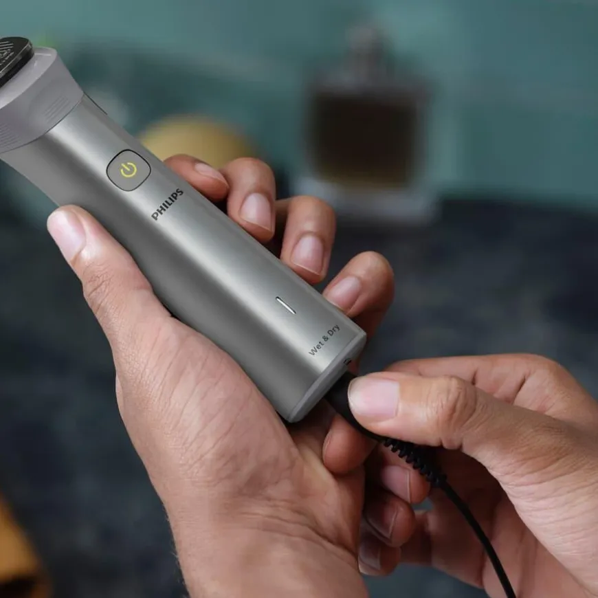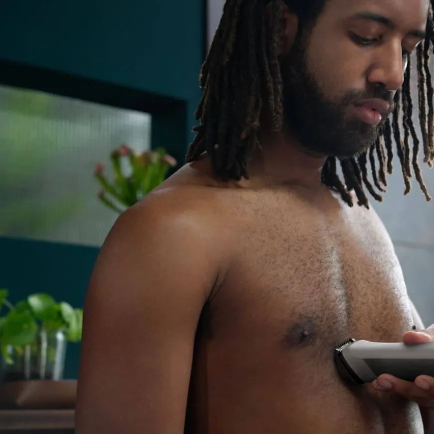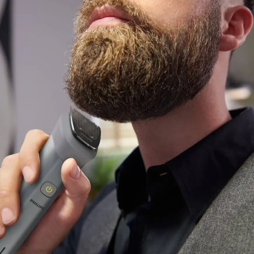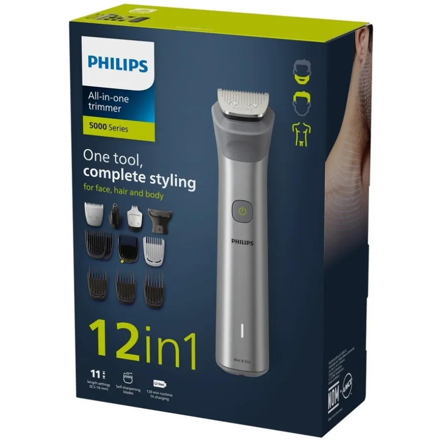 Philips All-in-One Trimmer Series 5000 er et alt-i-ett verktøy for komplett styling – perfekt for ansikt, hår og kropp. Sett sammen din egen personlige stil med denne allsidige trimmeren, som inkluderer 12 kvalitetsverktøy for styling av ansikt, hode og kropp. Selvslipende blader i rustfritt stål gir nøyaktig trimming – uten behov for olje – og holder seg skarpe som på dag én.