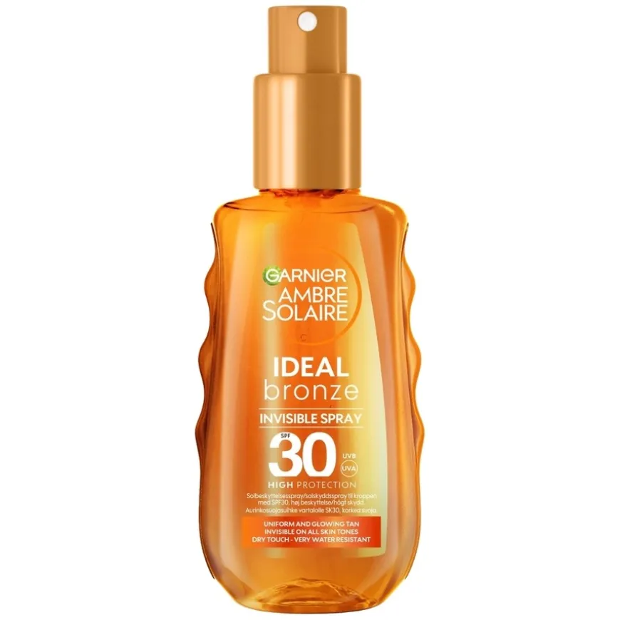 Garnier Ambre Solaire Ideal Bronze Invisible Spray SPF30 er en solbeskyttelsesspray til kroppen for jevn farge og flott glød. Formelen beskytter mot UVB, UVA og lange UV-stråler og er beriket med antioksidanter som motvirker aldring av huden.