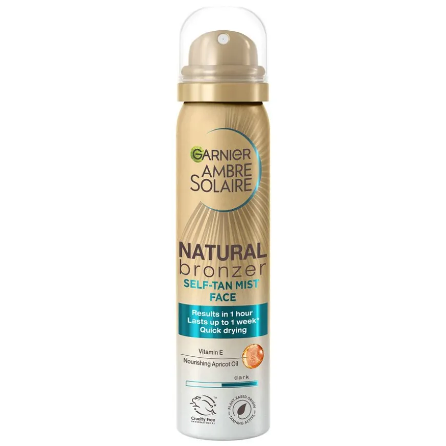 Ambre Solaire Natural Bronzer Self Tan Face Mist Spray er en selvbruningsspray til ansiktet. Formelen er beriket med aprikosolje og gir deg en vakker solkysset glød. Den har en nærende formel som tørker raskt og gir huden din en vakker solbrun glød som holder i 1 uke* – resultater på kun 1 time. Sprayformatet gjør det lettere å oppnå en jevn og ensartet farge uten at du behøver å bruke hansker. Travel size, så du kan ta den med deg overalt!