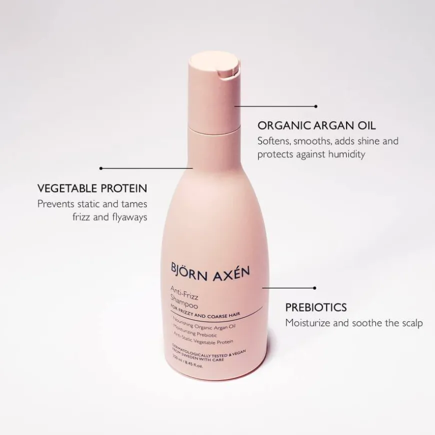 Anti-Frizz Shampoo er en shampoo som er utviklet for å møte behovene til frizzy og grovt hår som trenger ekstra næring og fuktighet. Den er beriket med økologisk arganolje, som mykner, glatter ut og gir håret glans, samtidig som det beskytter mot luftfuktighet. Prebiotika beroliger hodebunnen, mens vegetabilsk protein reduserer statisk elektrisitet og gjør håret mer håndterbart. Shampooen har en herlig orientalsk duft med noter av mandarin, ylang-ylang og vanilje, og passer spesielt for grovt og frizzy hår.