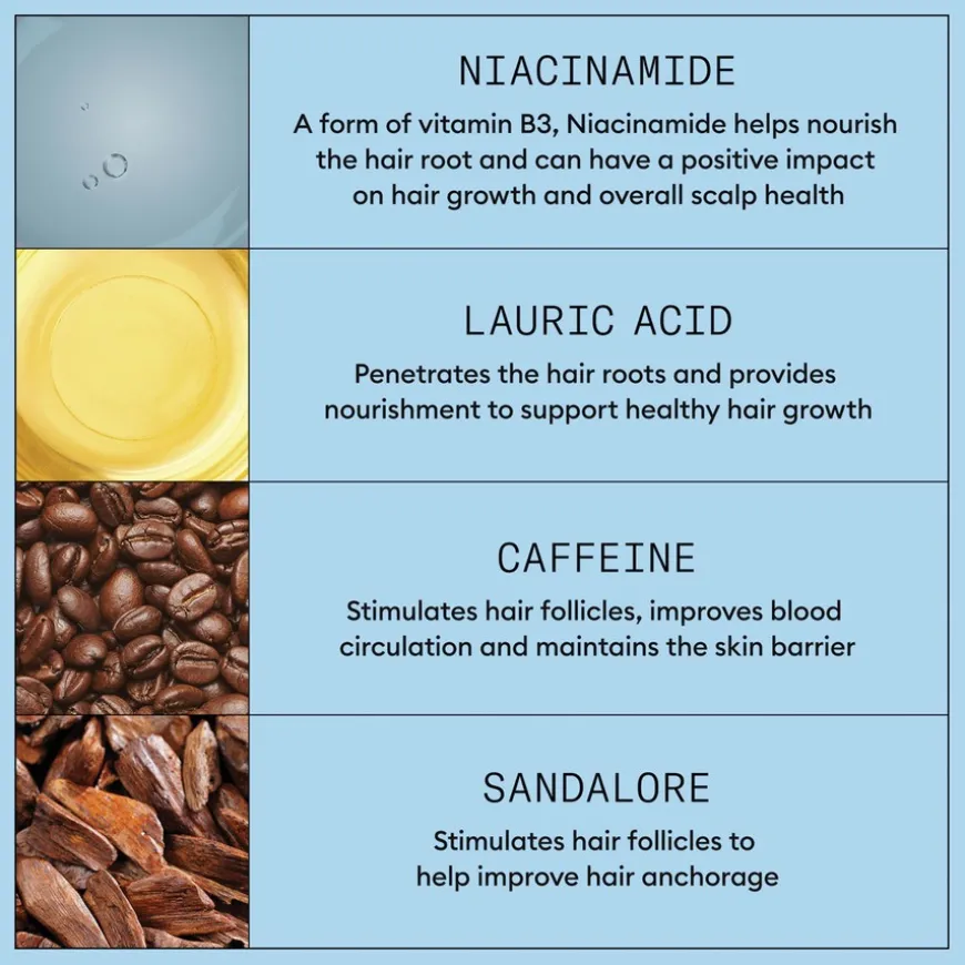 Aqua/Water/Eau, Sodium Laureth Sulfate, Sodium Lauryl Sulfate, Cocamidopropyl Betaine, Caffeine, Sandalore, Sodium Benzoate, Citric Acid, Mentha Arvensis Leaf Oil, Panthenol, Salicylic Acid, Lauric Acid, Niacinamide, Trisodium Ethylenediamine Disuccinate, Methylparaben, Polyquaternium-10, Mentha Piperita (Peppermint) Oil, Sodium Hydroxide, Limonene, Biotin, Alcohol, Tocopherol, Sodium Citrate, Sodium Chloride, Sodium Xylenesulfonate.
