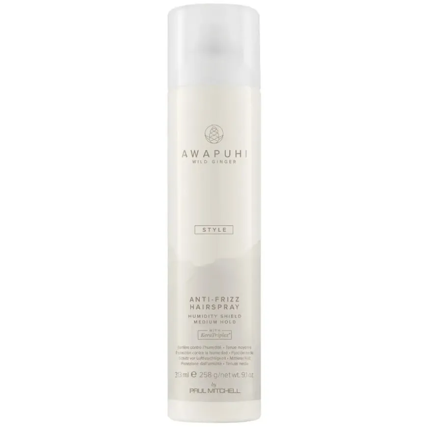Awapuhi Wild Ginger Anti-Frizz Hairspray er en ultra-tørr hårspray med medium hold som beskytter mot fuktighet og forebygger frizz.