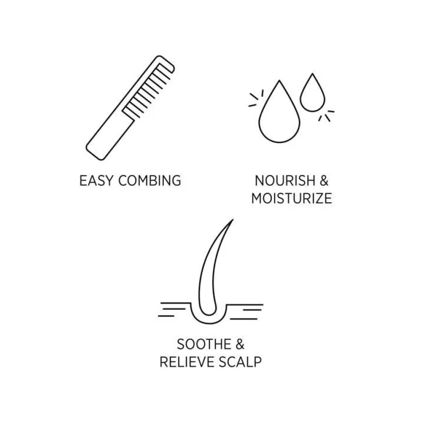 - Beroliger, fukter og gjenoppretter hodebunnen og gjør håret lett å gre.