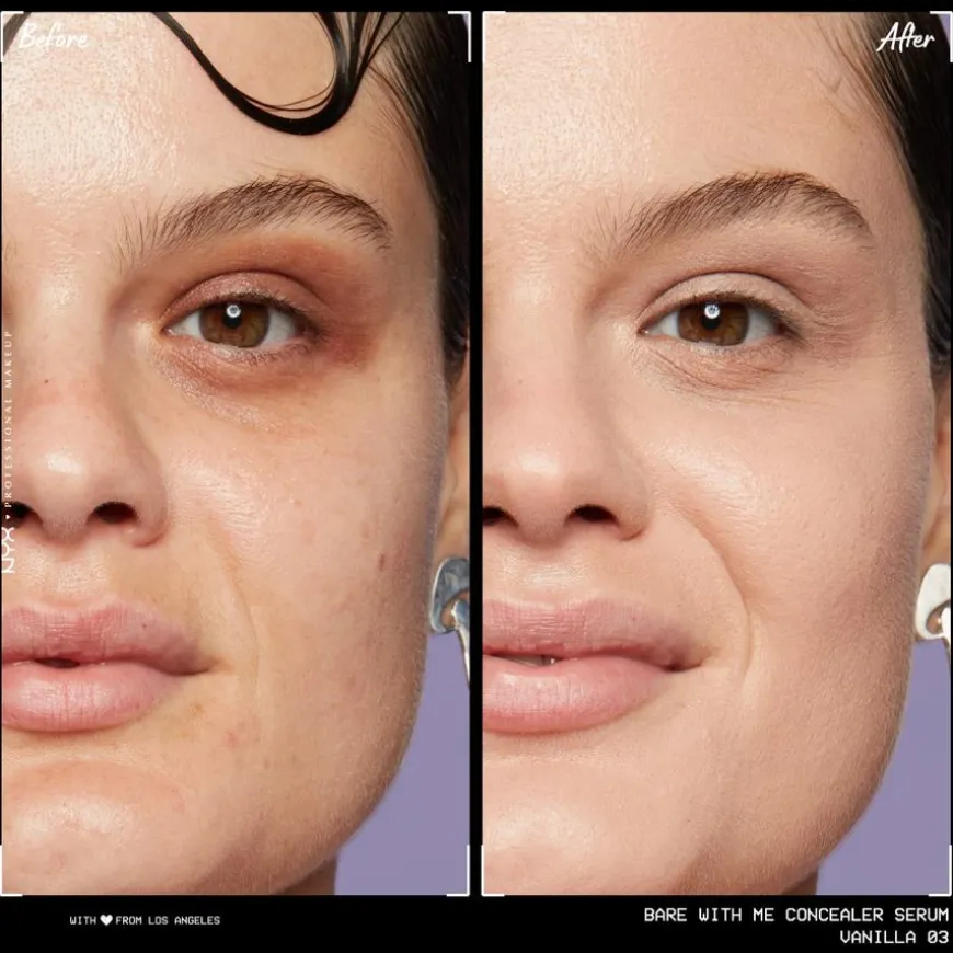 NYX Professional Makeup Bare With Me Concealer Serum er en hudpleiende concealer-serum for både ansikt og kropp, utviklet for å gi opptil 24 timers fuktighet og naturlig dekning. Denne veganske formelen* kombinerer hudpleie og makeup i ett, og gir huden en fuktet, jevn og komfortabel følelse hele dagen. Dette er en ekte skintervention! Mørke ringer, urenheter, rødhet og tørre områder dekkes effektivt, samtidig som huden får næring og fukt. Formelen er beriket med tremella-sopp (gelésopp), Centella Asiatica (cica) og grønn te, som gir pleiende fordeler og en lett, nesten usynlig finish. Produktet smelter inn i huden uten å klumpe seg, og gir et naturlig resultat som varer.