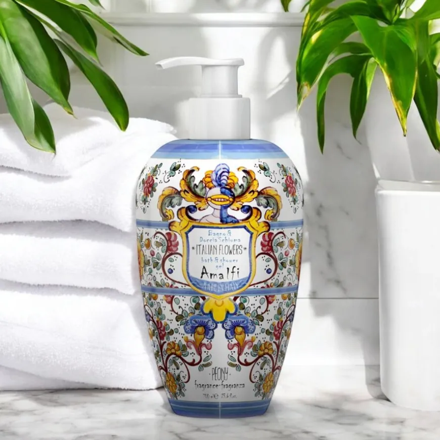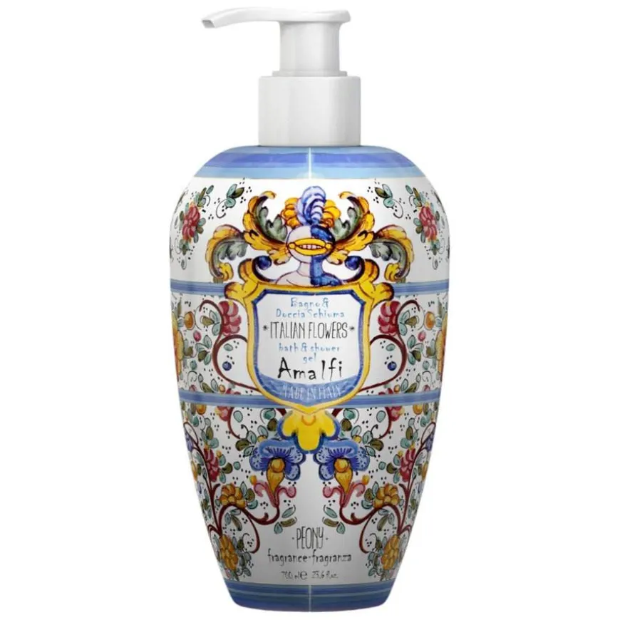 Bath And Shower Gel Amalfi Peony er en herlig generøs og rikt skummende såpe som kan brukes som både badeskum og dusjgele. Beriket med Aloe Vera juice og vitamin E for å gi ekstra fuktighet og næring til huden slik at den ikke tørker ut. Er med på å holde huden myk og frisk, og etterlater en helt nydelig frisk duft. Frisk sødme fra appelsinblomst og en ren og elegant aroma fra hvitamin rose kombinert med en myk og innbydende undertone av saftig, fruktig fersken. En fortryllende og forfriskende duft, med en skjønn symfoni av delikate noter.